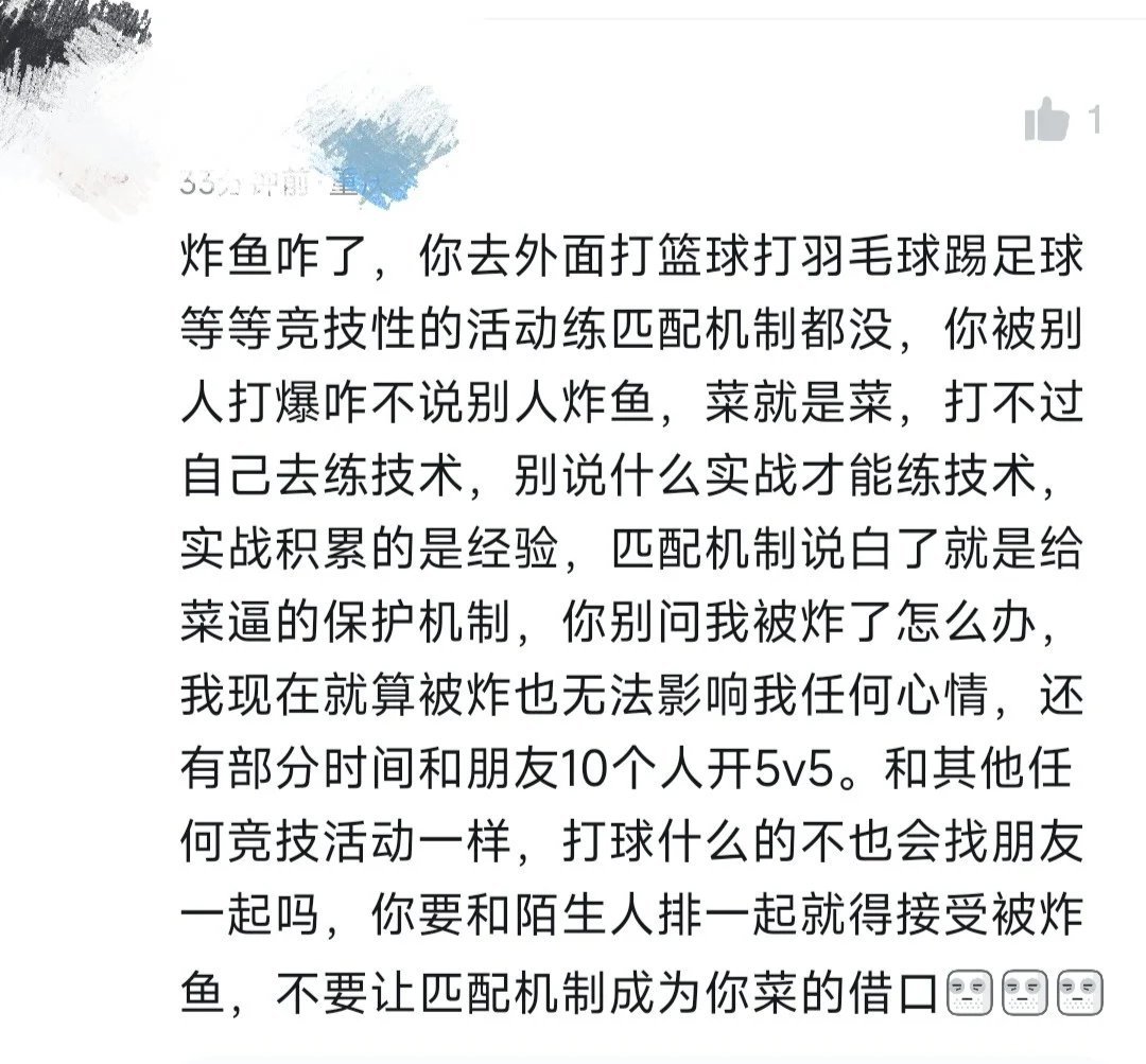 當然我本人素質也不是很高尚,也是“出口成髒”以前也做過類似的事情比如贏了扣個? (不過多嘲諷,大家想噴就噴),但現在我一般什麼都不會說,至少不會在公屏上嘲諷,要不就是打“又混了一把”這種類似混子的語言。就算講也是和朋友講“今天遇見炸魚哥帶我爽混一把”而不是嘲諷。