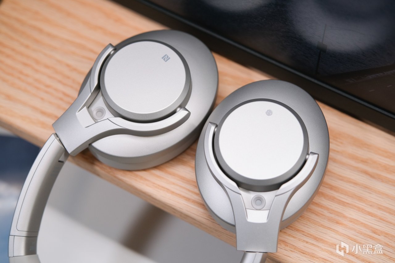 值得稱讚的是,右邊耳罩外側位置有一個NFC標誌,意味着我們可以直接NFC連接,左邊耳罩則是指紋標誌,我們可以在整個側面空間區域進行音量的調節、歌曲切換、暫停等等觸控操作,免去了按鍵的設計,整體看起來就更加的簡單,更具高級感。