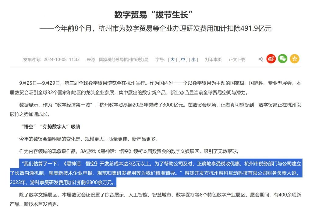此外,根據杭州市征服文件披露,《黑神話:悟空》開放成本僅爲約4300萬美元。換算一下,3億人民幣約爲4300萬美元,這在如今的3A遊戲界是罕見的低成本。