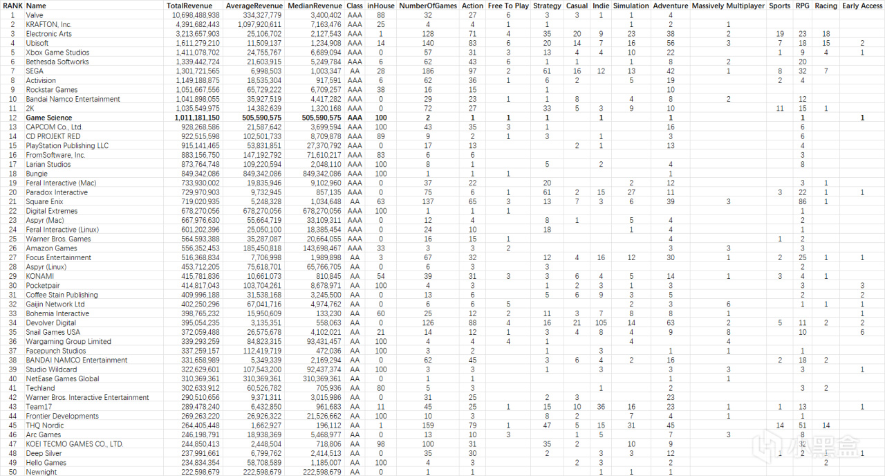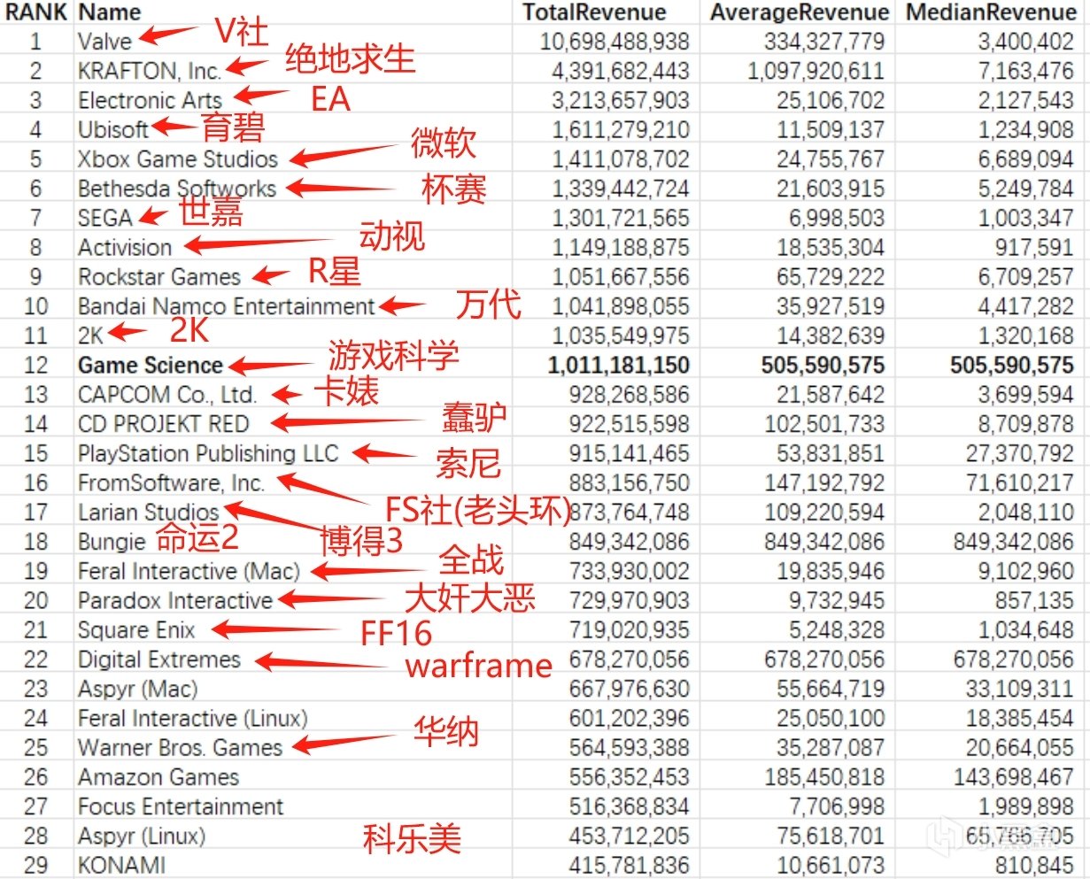 據Gamalytic數據:遊科僅憑黑神話這一款遊戲,就躋身Steam歷史總收入前12了(擠掉了CAPCOM和波蘭蠢驢)