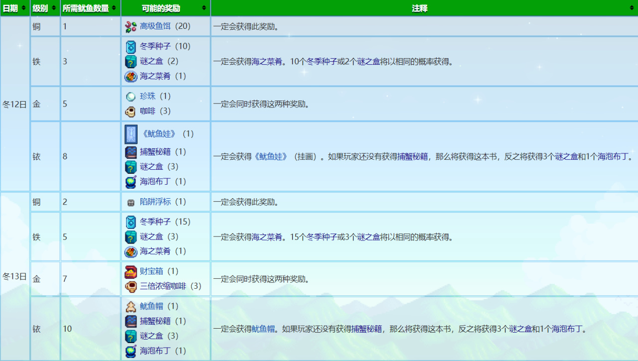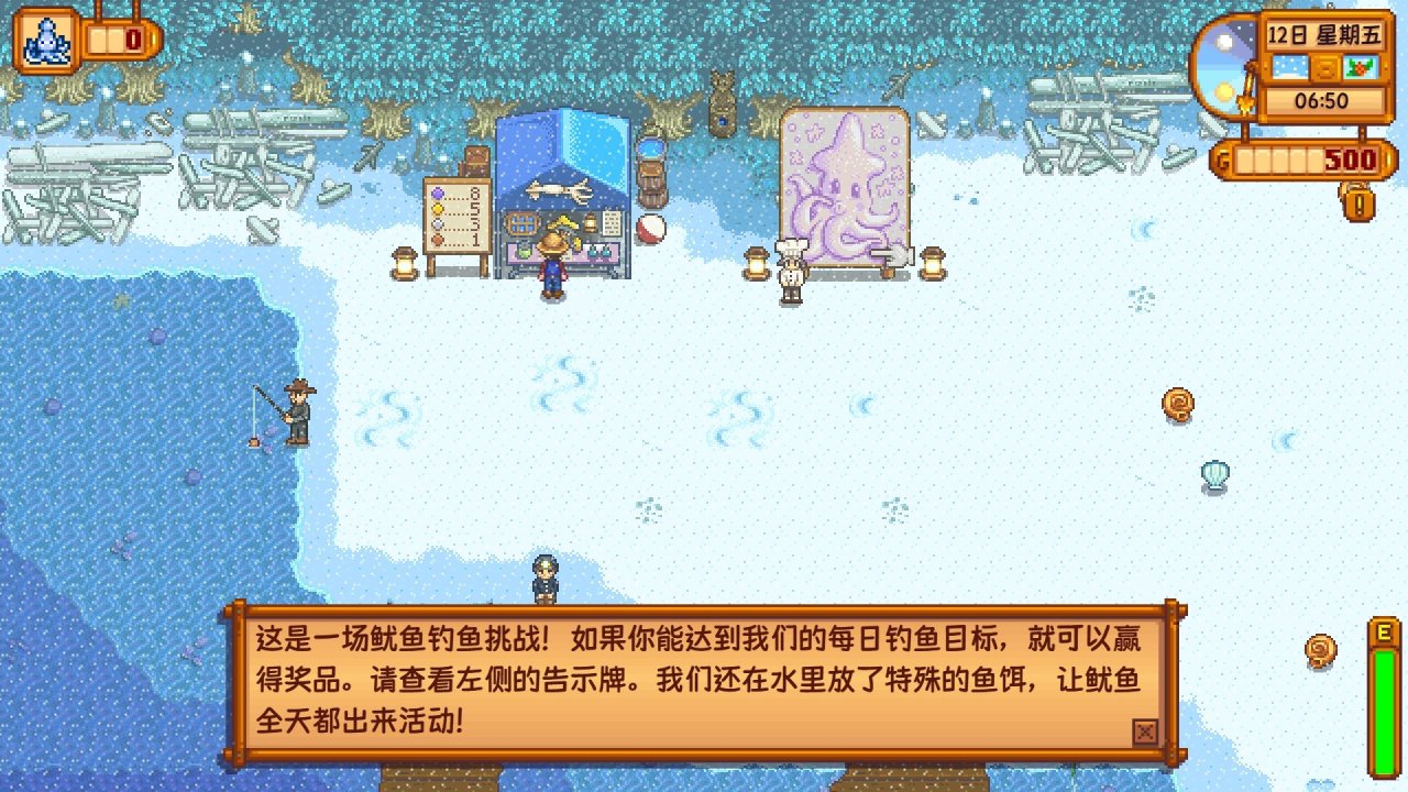 節日介紹:魷魚節顧名思義就是釣魷魚的,在該節日期間,魷魚會全天出沒,當你釣到一定數量時可以獲得獎勵,到下圖中的商鋪即可獲得獎勵,釣到魷魚的數量越多獎勵越好,具體的數量要求會顯示在商鋪左側的指示牌上,從下到上分別是銅—鐵—金—銥,每天的數量要求會變化