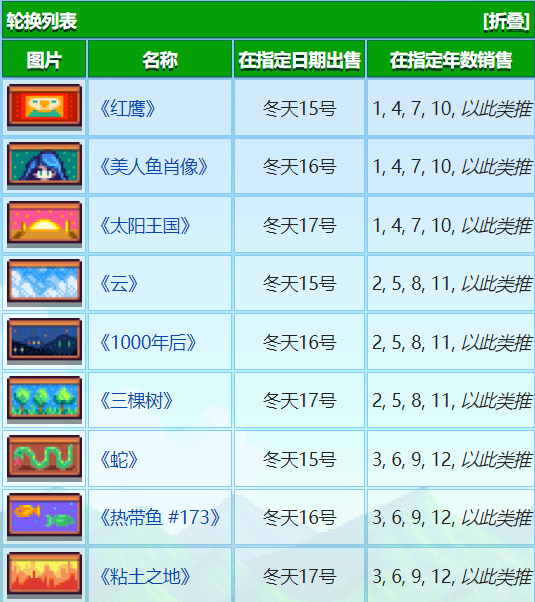 這位畫家名叫盧皮尼,他會在夜市每天都以1200金的價格出售自己不同的畫作,這些畫作每三年輪一次,一共有9幅畫作,具體畫作以及出現時間如下圖所示,各位看到自己喜歡的畫作不要錯過了