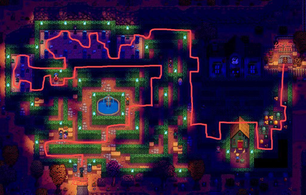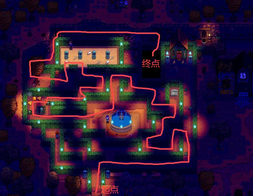 然後這個節日的主要活動就是走迷宮,迷宮就在第一個臺階的上方處,直接進入即可,終點會有一個寶箱,打開可以獲得一個黃金南瓜或一張兌獎券,奇數年的迷宮很簡單,但偶數年的迷宮會比較大和複雜,不過也不難,下面我把迷宮的路線圖給大家(畫的有點醜,請見諒),大家開完寶箱後在旁邊都會有個礦車,坐礦車就能回到起點附近,不用重新走迷宮回去
