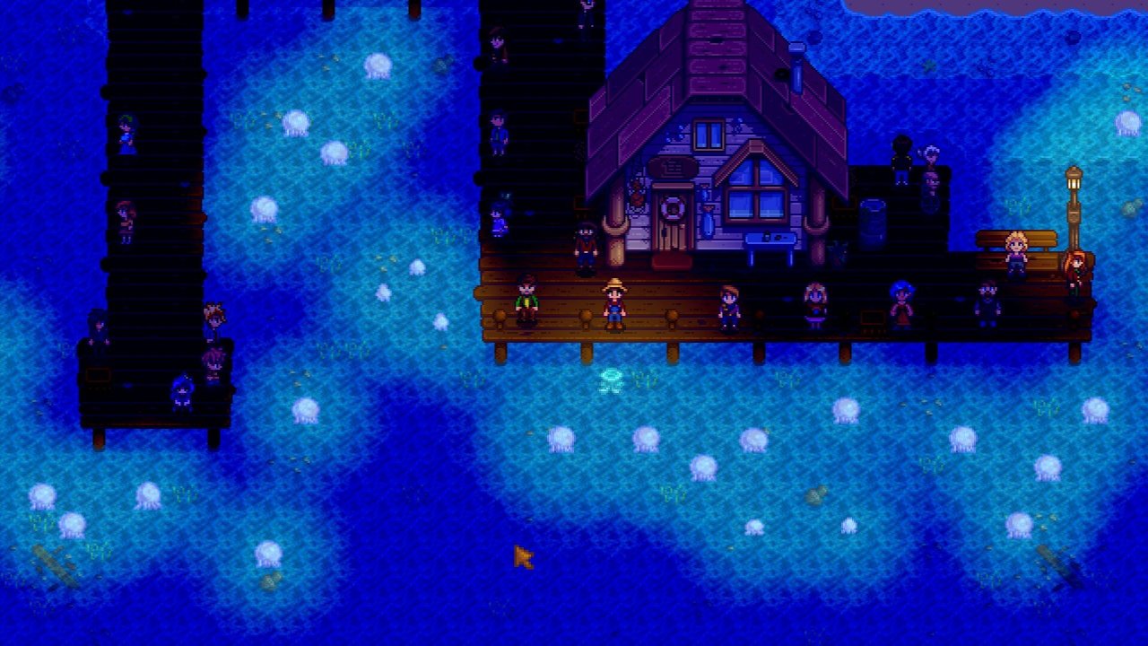 最後,其實這個節日就是看水母的,沒有物質上的獎勵,但會給予你一點精神上的鼓勵,整個夏季你一定很勞累,這個節日就是讓你放鬆身心的,喜歡聊天的就去周圍與村民對話(有些藏的很隱祕),不想聊天的就直接去和劉易斯對話選擇開始看水母即可,看完後節日就結束了,你會回到農場,時間是凌晨12.,一覺過後,告別夏季,迎來秋季