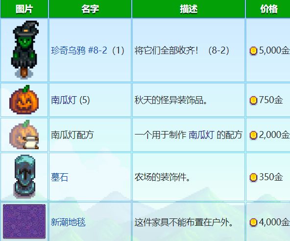節日介紹:首先,在該節日上皮埃爾又會出來擺攤(等等,我爲什麼說又),具體出售的物品如下圖所示,這裏比較重要的有珍奇烏鴉和南瓜燈配方,是後期配方全收集需要用到的物品,其餘物品都是一些傢俱和裝飾物,各位根據自己需求去購買即可