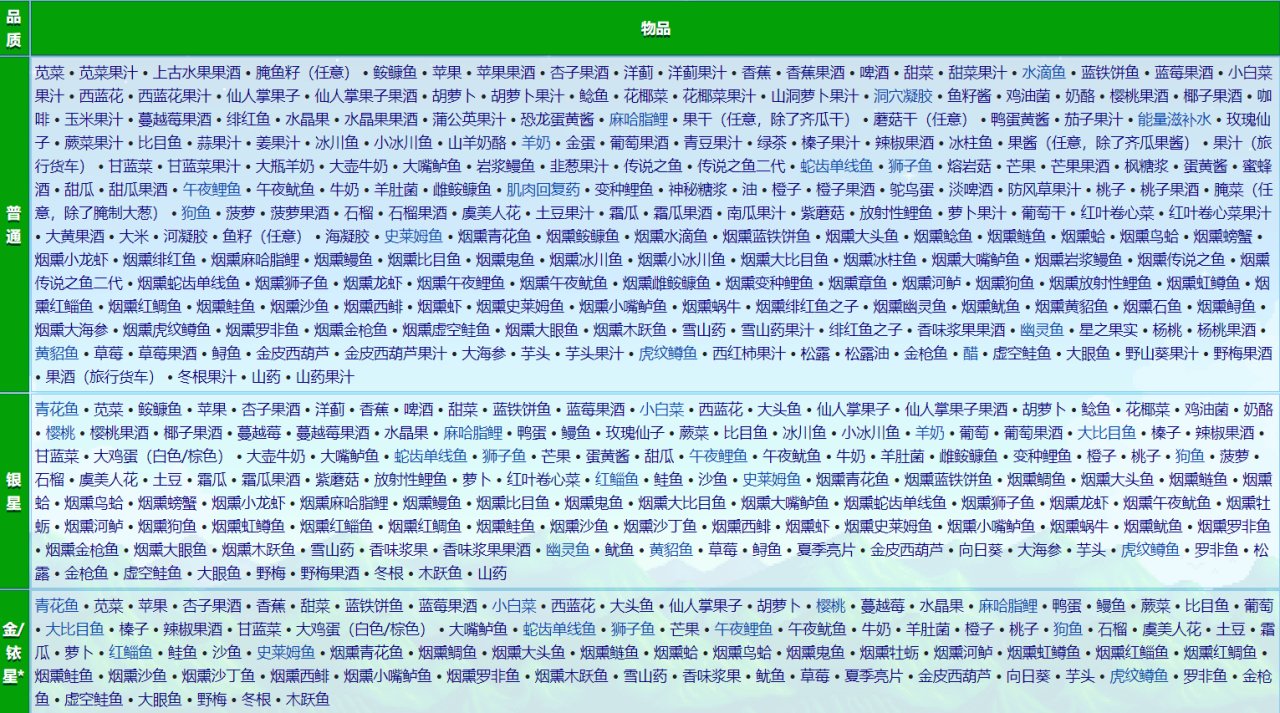 我們新手第一次參加這個節日的話,我不推薦大家加入紫色短褲,第一年先好好玩,等以後參加再加,因爲上面涉及的物品比較多,所以我這裏根據第一年夏季可以獲得的物品,給大家推薦幾個加入能獲得“最好的評價”和“好的評價”的物品,首先是“最好的評價”,這裏建議大家去礦井60層釣魚,有概率釣到冰柱魚,加入銀星的冰柱魚可以獲得最好的評價,還有就是可以到山區湖泊釣魚,夏季能釣到鱘魚,加入金/銥星的鱘魚也能獲得最好的評價