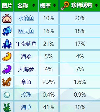 我們需要支付1000金,潛艇上的船長就會操控潛艇下降,爲我們提供一次深海釣魚之旅,下降時間大約爲30分鐘(遊戲時間),當我們準備返回時,只需再與船長對話一次即可,雖然營業時間在晚上11.結束,但如果你是在11.之前進入的話,是可以一直釣到凌晨2.的,在深海可釣到的魚如下圖所示,需要注意的是水滴魚、幽靈魚、午夜魷魚這三種魚在前期只能在這個釣魚潛艇裏面釣到,而且這三種魚還是魚類圖鑑全收集的必需品,所以我建議各位還是要在夜市期間下去深海釣釣魚