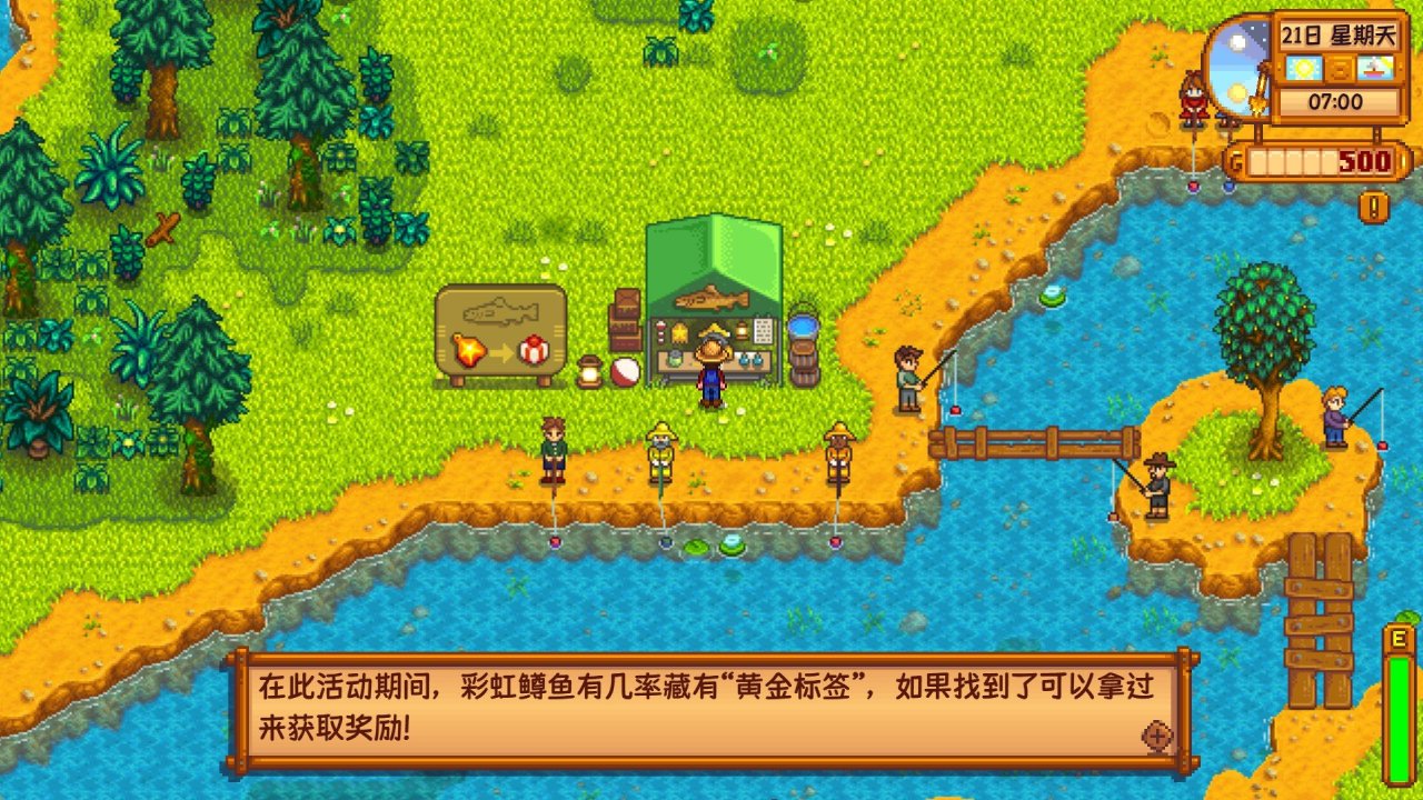 節日介紹:該節日顧名思義就是釣虹鱒魚的,與平時不同,在節日期間虹鱒魚是全天出沒的,在煤礦森林河流就能釣到,每當我們釣到一條虹鱒魚時,就會有33%的概率獲得黃金標籤,獲得黃金標籤的概率與一次性釣到虹鱒魚的數量成正比,比如說你一次性釣到兩條虹鱒魚,那獲得黃金標籤的概率就是66%,三條就是99%,黃金標籤可以在附近的攤位上兌換獎品