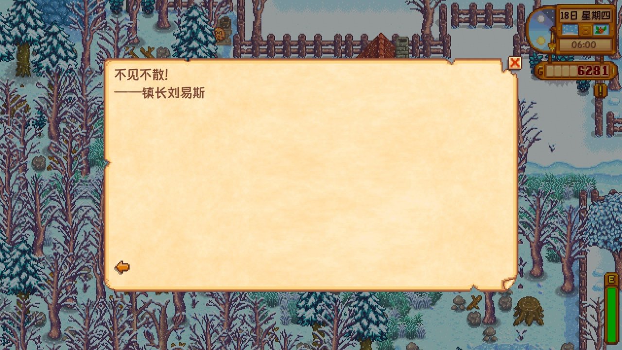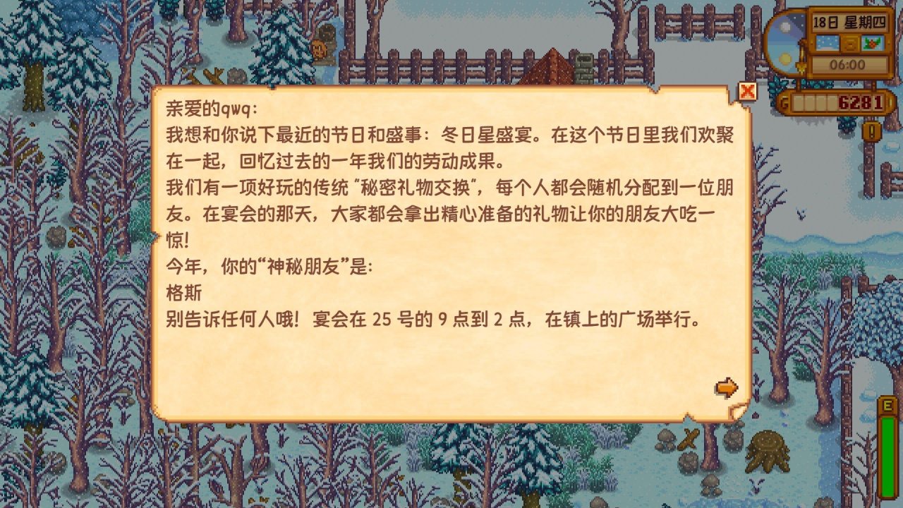 節日介紹:該節日的主要活動是祕密禮物交換,一個隨機的村民會被選爲送你禮物的人,你也會被隨機指定送一個人禮物,在節日的一星期前,也就是18日當天,劉易斯會寄信給你,信中會告訴你需要給誰送禮物,比如我這裏是格斯