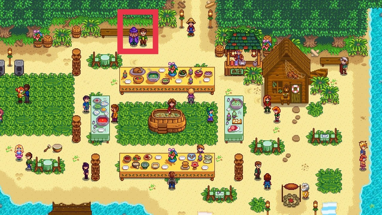 節日介紹:這個節日的主要任務就是給湯加料,也就是上圖中央的那鍋湯,我們走過去右鍵點擊這鍋湯就能選擇我們揹包中的個別物品加入進去,只能選擇一樣物品加入,我們加完料以後去和劉易斯互動,州長就會來品嚐這鍋湯並作出評價,等州長評價完以後該節日就會自動結束,你會自動回到家門口,時間是晚上10.