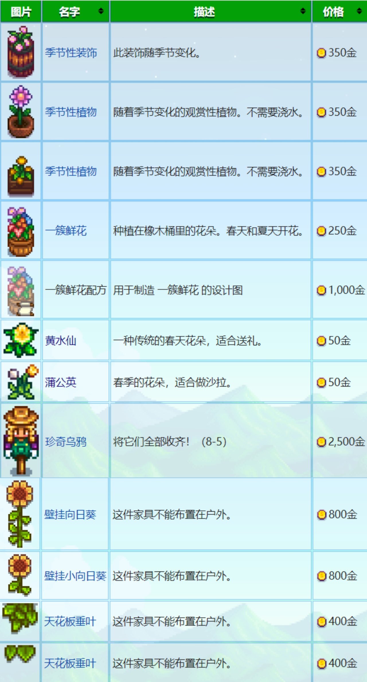 節日介紹:花舞節的主要活動就是跳舞,你可以邀請一位你喜歡的單身且可結婚村民跳舞(第二次對話即可選擇是否邀請),但你需要與你想邀請的村民至少達到4❤️好感度纔行,不然別人是不會受邀的,跳舞后會增加該村民1❤️好感度,另外,在這個節日上皮埃爾也會擺攤,出售的物品有下圖這些,大家可根據自己需求去購買