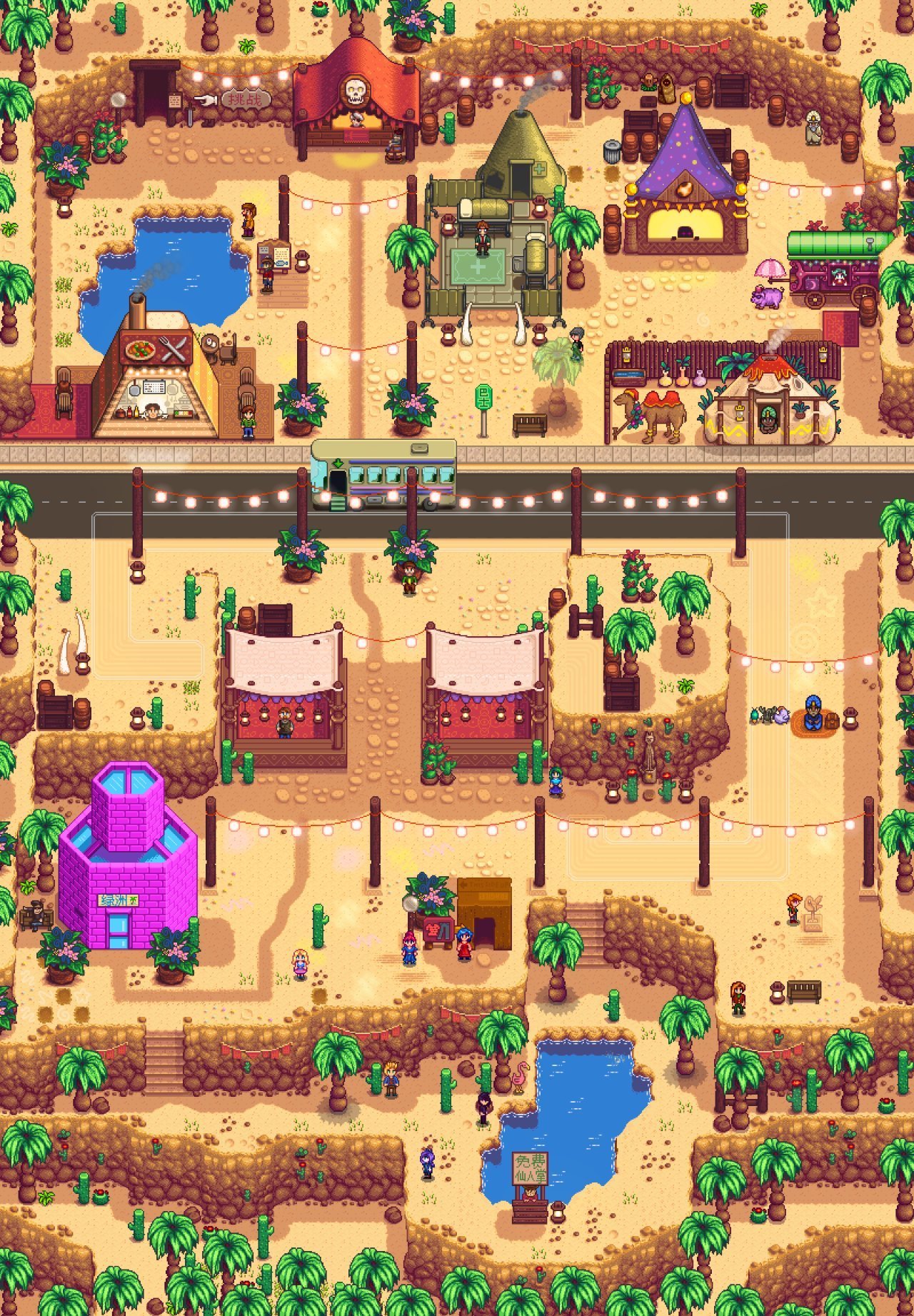 舉辦地點:沙漠(需要玩家先解鎖沙漠後才能參加這個節日,想要解鎖沙漠需要完成社區中心金庫板塊的所有收集包,完成後才能修好公交車,之後即可前往沙漠,新手第一年參加不了很正常,在沒解鎖沙漠前,日曆中的沙漠節會顯示成???,待你修好公交車後纔會解鎖)