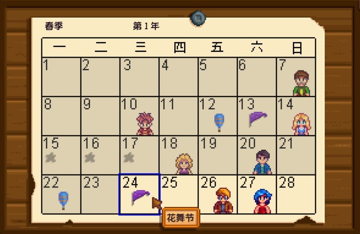 最後,我不建議大家在第一年去參加花舞節,因爲24日前你是很難和一位單身村民達到4❤️好感度,所以你去了也是站在那發呆的,別人不會跟你跳舞,而是跟其他村民跳,你只能站那看別人跳,還要被別人拒絕,直接成小丑了,皮埃爾出售的物品在第一年也不是很重要,所以除非皮埃爾出售的物品有你需要的,不然第一年我不建議各位新手去參加這個節日,可以無視