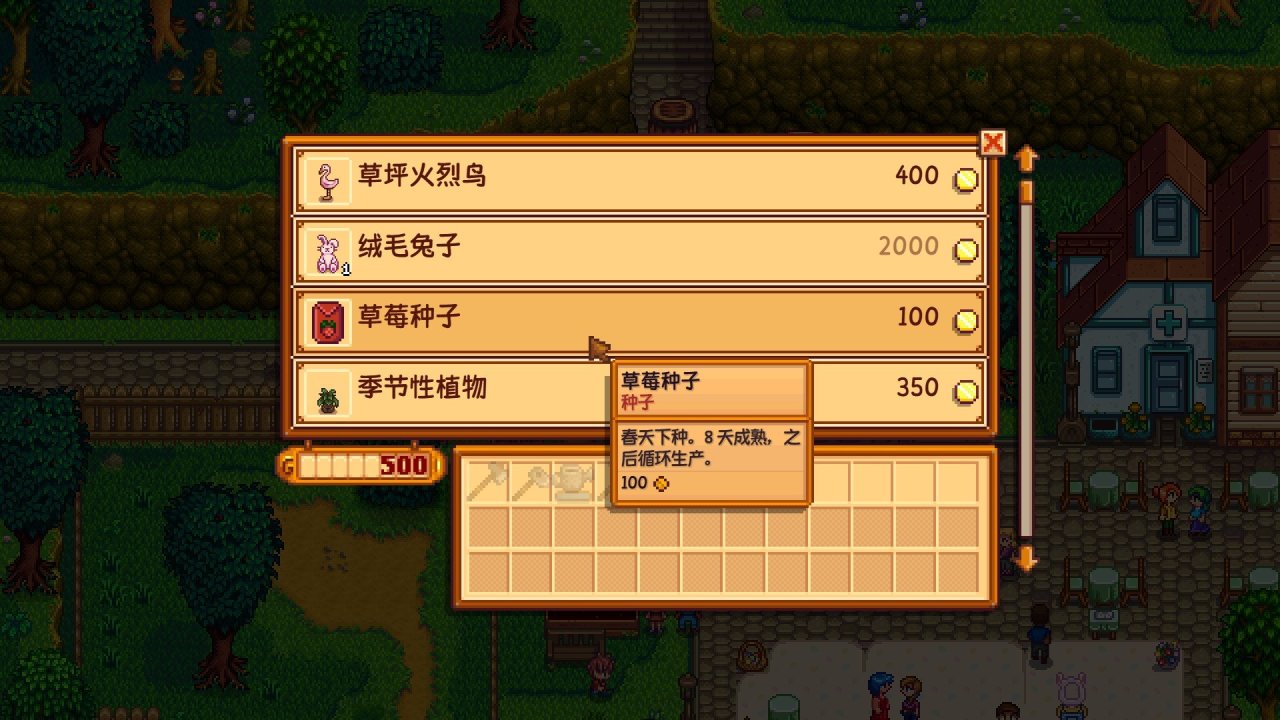 這裏皮埃爾會出售草莓種子,其它物品你都可以不買,但這草莓種子我是很推薦你一定要去買的,因爲草莓是整個春季最賺錢的作物,也是你第一桶金的來源,所以大家前面一定要多存錢,留到復活節的時候購買大量草莓種子(根據自己灑水器數量去購買,沒灑水器的話不要買太多,我怕你澆水澆不過來了)