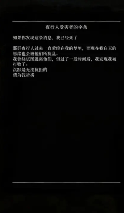 晚上过来会看到一个吊在树上的尸体,随后出现三个“夜行者”,装扮非常吓人,走路没有声音。解决掉后开枪打断绳索,获得尸体上的文件。