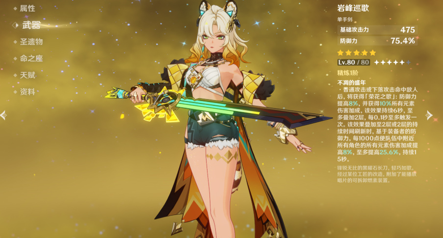 在武器方面,新出的五星單手劍“巖峯巡歌”和老五星“蒼古自由之誓”、“天空之刃”是不錯的選擇,沒有的話四星武器西風劍、息燧之笛、辰砂之紡錘、祭禮劍、原木刀、灰河渡手也可以選擇,如果這些武器還沒有,那三星武器飛天御劍也能用。