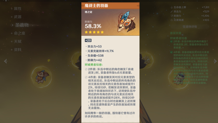 聖遺物方面,首選“燼城勇者繪卷”套裝,其次用昔日之歌或宗室套 。如果都沒有,可以2燼城、2絕緣或2防禦過渡。主詞條選擇充防防,副詞條方面百分比防禦=充能>雙爆>其他。