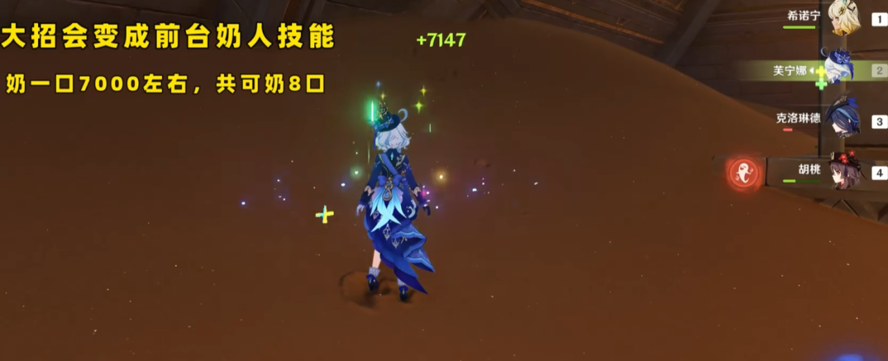 在輔助模式下希諾寧的元素爆發也有所變化,這次希諾寧會先對場上造成一次巖元素範圍傷害,然後持續回覆當前站場角色的生命值,希諾寧的大招一共可以奶8次,根據大佬測試,在給希諾寧充防防的配置時,希諾寧每一口奶量有7000+。