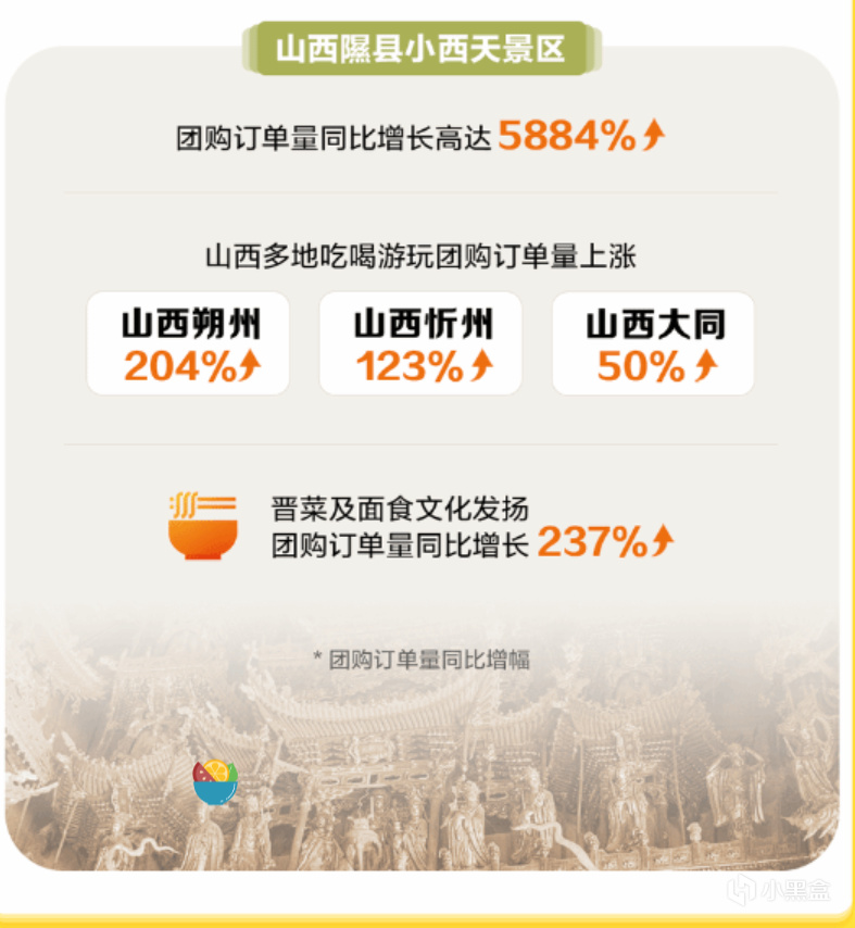 • 據媒體報道,自《黑神話:悟空》發售以來,山西省內各取景地迎來了巨大的增長,並引發了“縣城遊”熱潮,取景地之一的隰縣“小西天”景區10月1日至6日抖音團購訂單量同比增長達5884%!