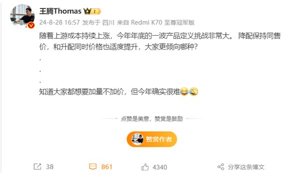 值得注意的是,今年8月,王騰發文稱,隨着上游成本持續上漲,今年年底的一波產品定義挑戰非常大。