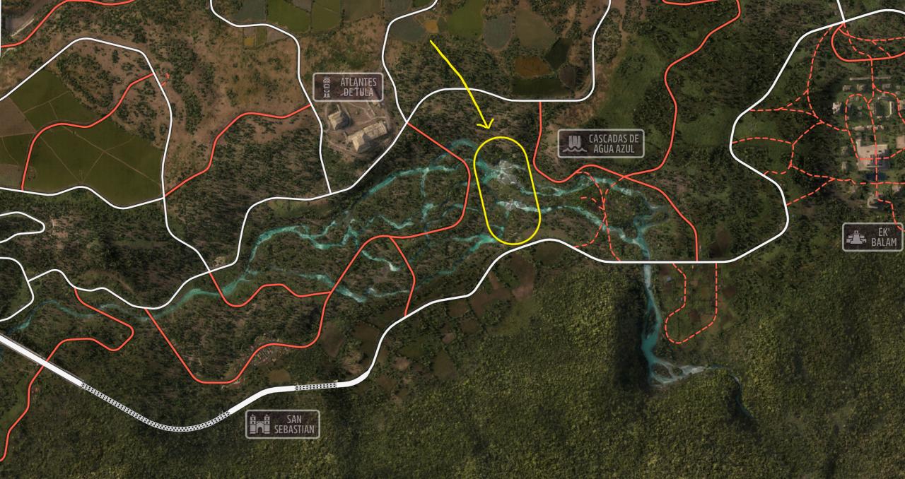 藍水瀑布的範圍如上圖所示,駕駛指定車輛進入該區域並於瀑布合影留念,挑戰至此完成。