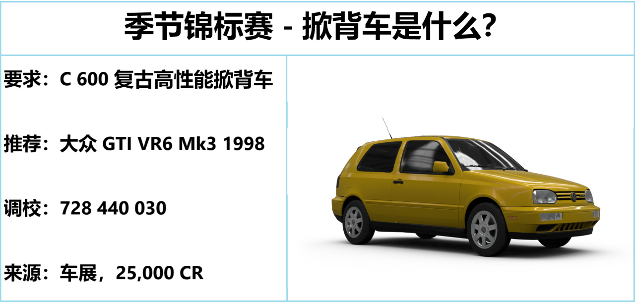 比賽限定 90 年代的復古掀背,就用這輛大衆 MK3 吧,季節賽常用車型,便宜好用,操控也不算差。