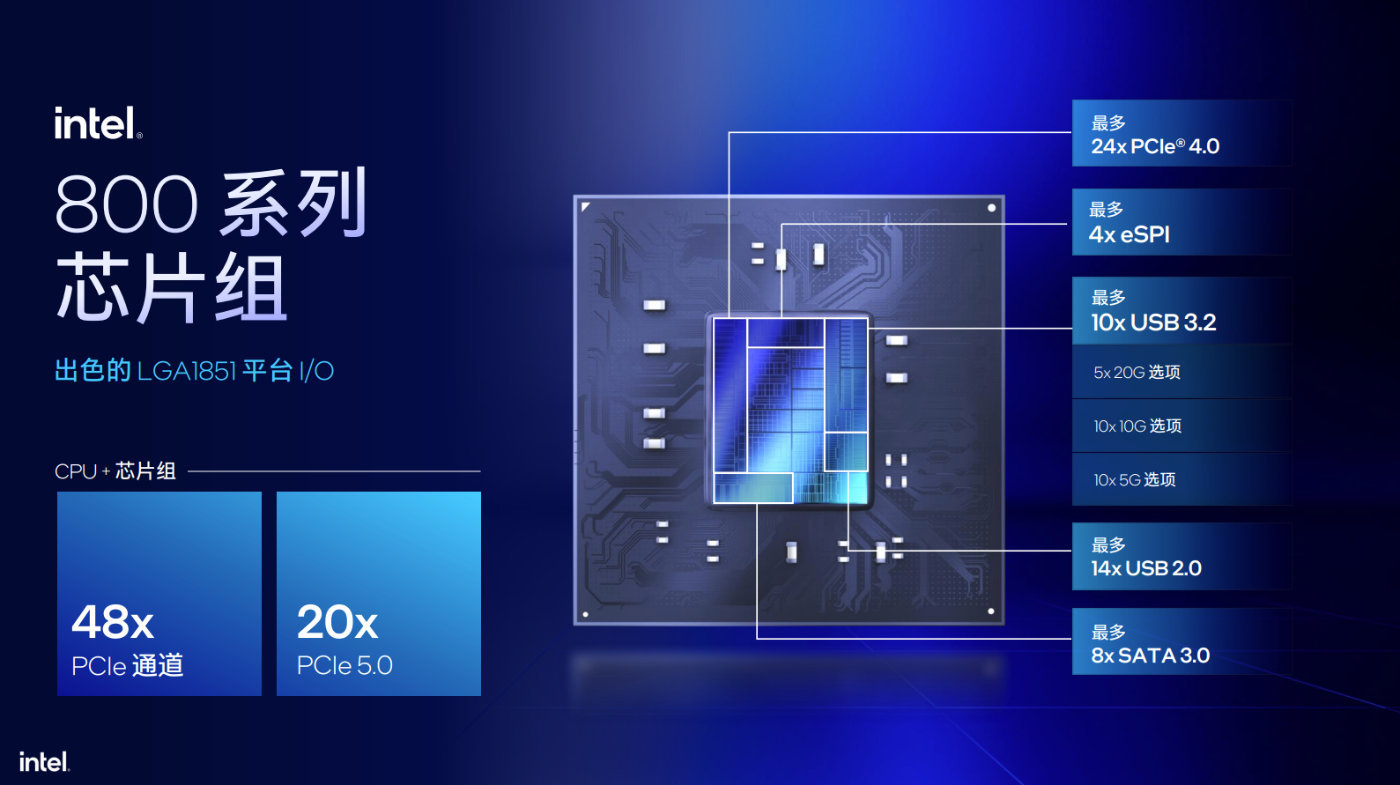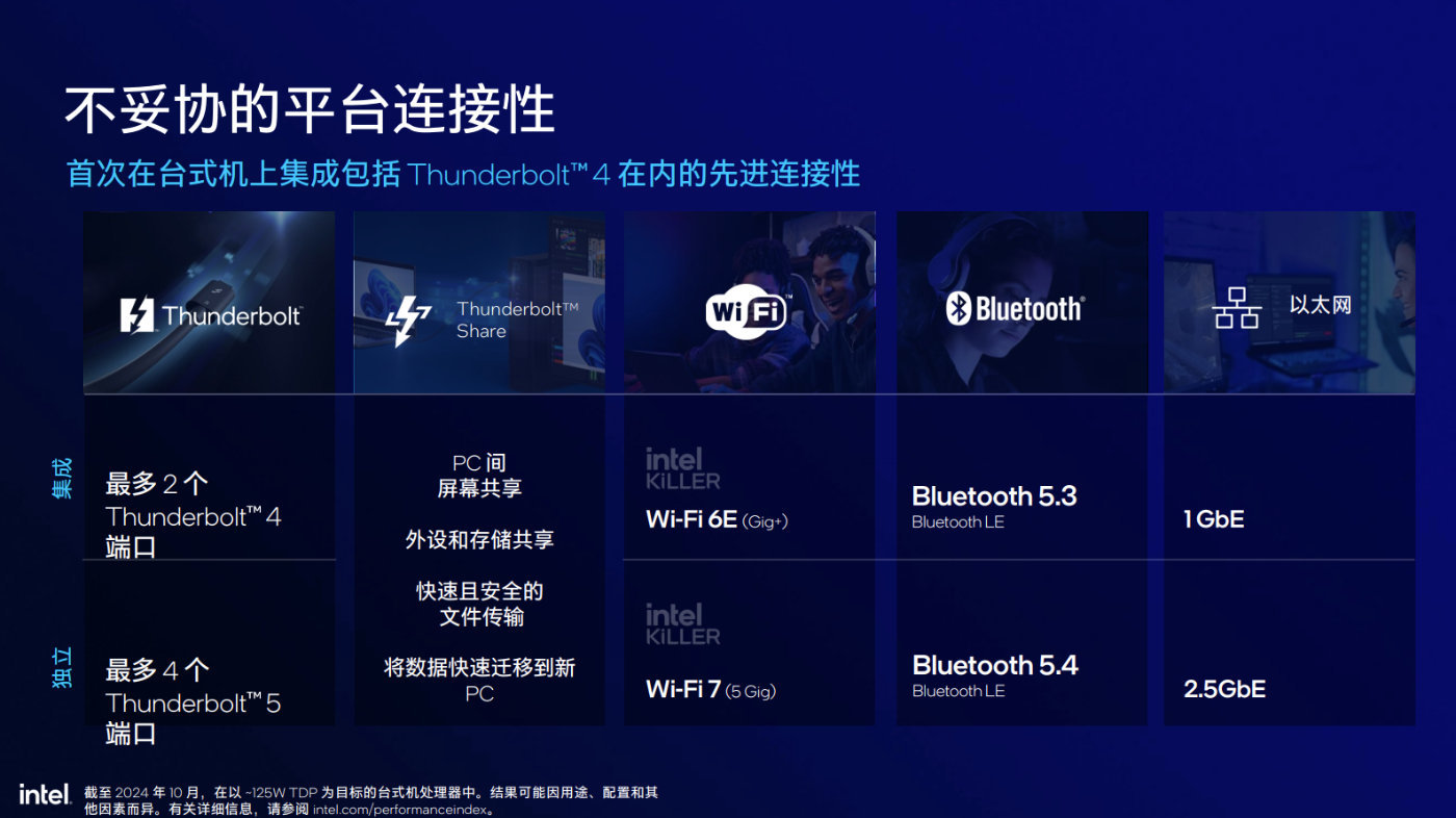 在擴展方面,Arrow Lake首次採用了LGA1851主板,搭配800系列芯片組,首發Z890主板,並首次集成了雷電4支持,以及提供獨立雷電5選項,通過Thunderbolt Share實現兩臺PC之間高速連接。無線連接中,則提供了Wi-Fi 6E和藍牙5.3的支持,並提供Wi-Fi 7和藍牙5.4,2.5Gbps網口選項,同時Killer網絡團隊也會給遊戲連接體驗保駕護航。
