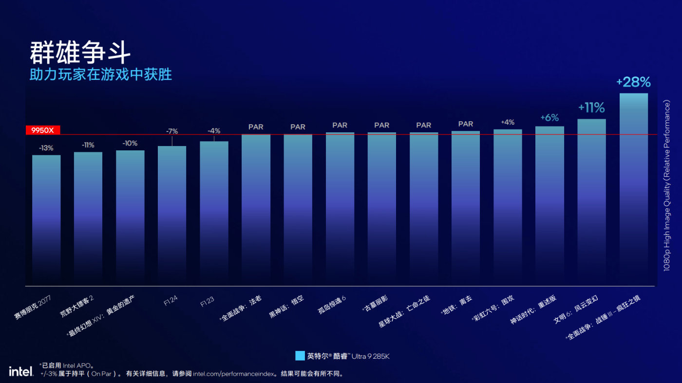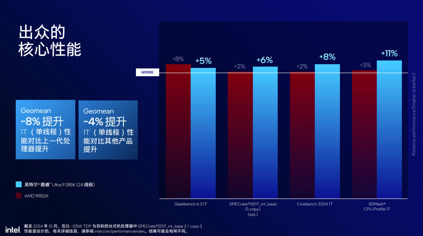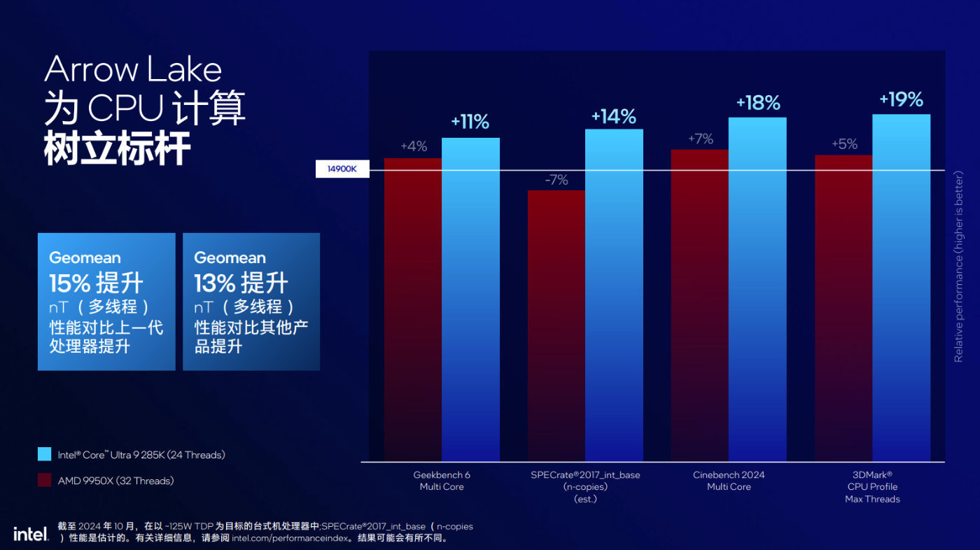 如果與AMD Ryzen 9 9950X競品做比較,酷睿Ultra 9 285K遊戲性能想到相當。在一些注重緩存性能場景中,酷睿Ultra 9 285K可以做到5%到7%的提升,而如果是多線程性能表現,酷睿Ultra 9 285K更勝一籌。