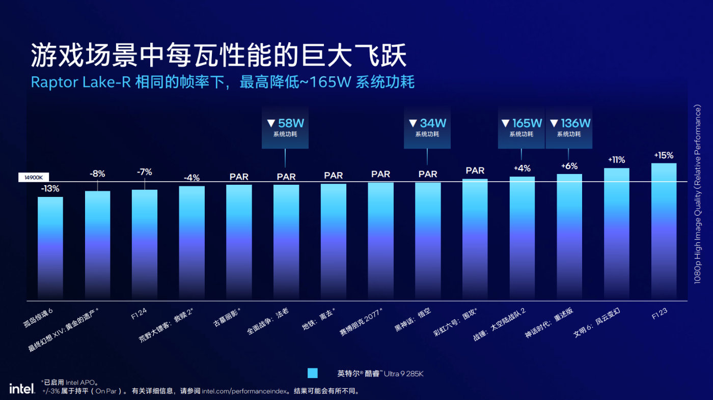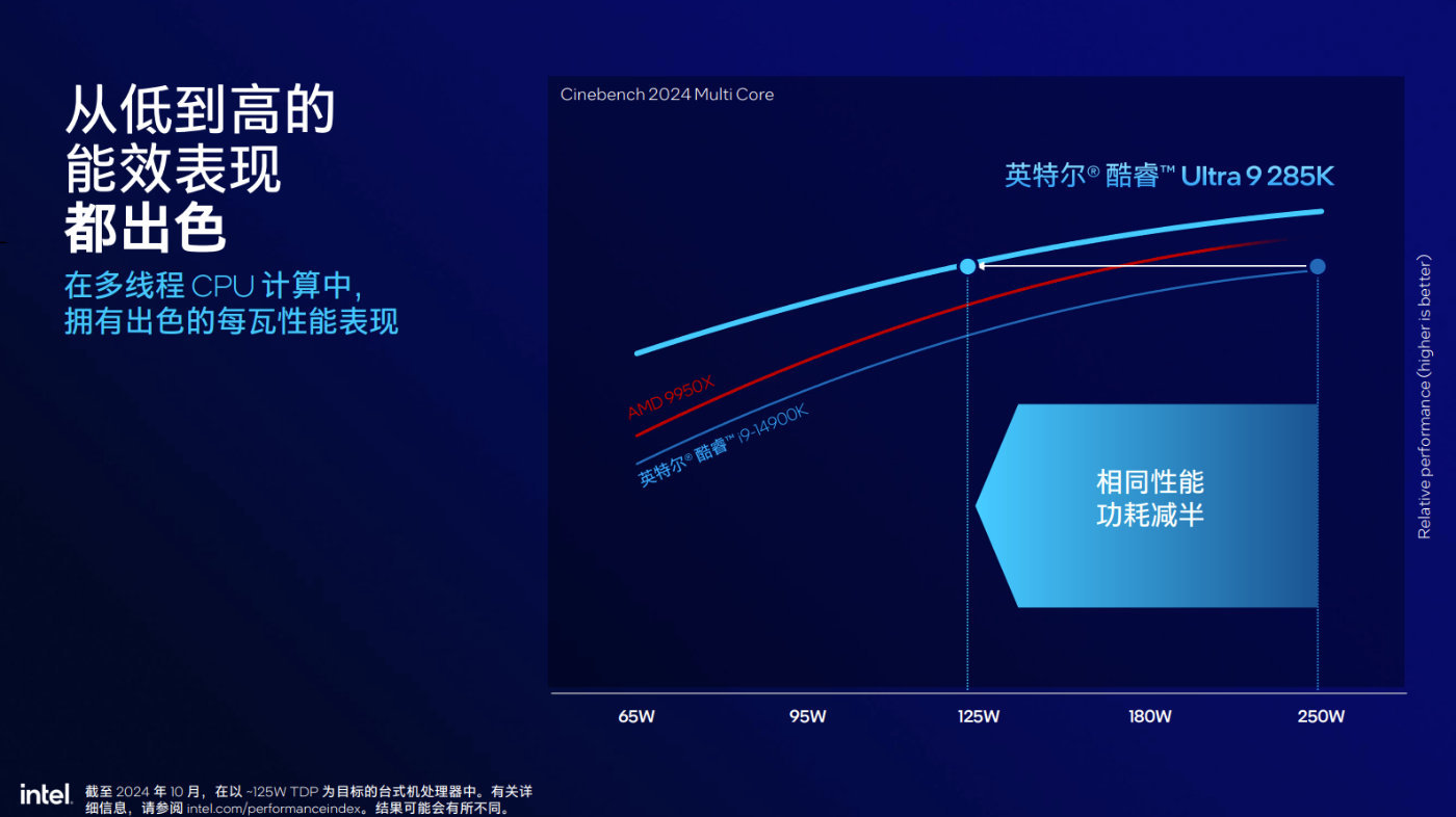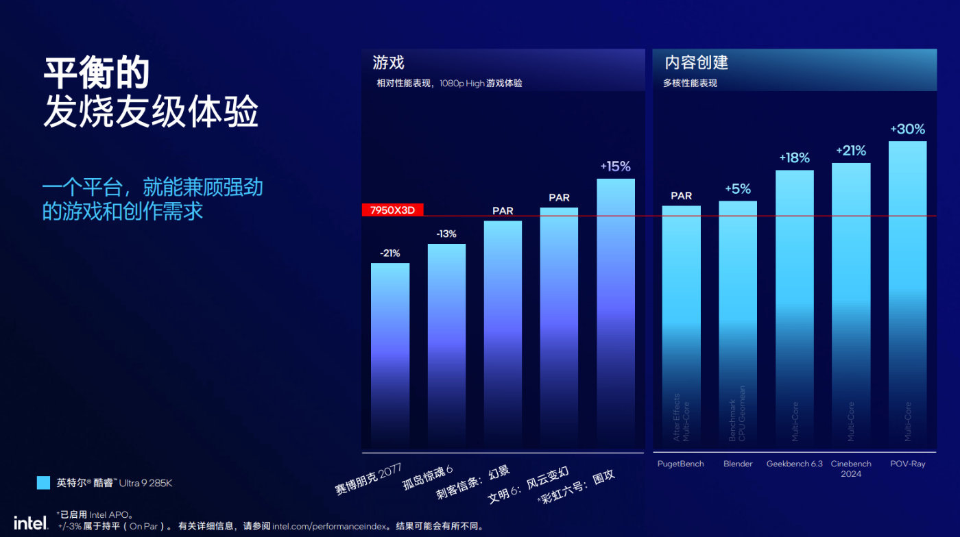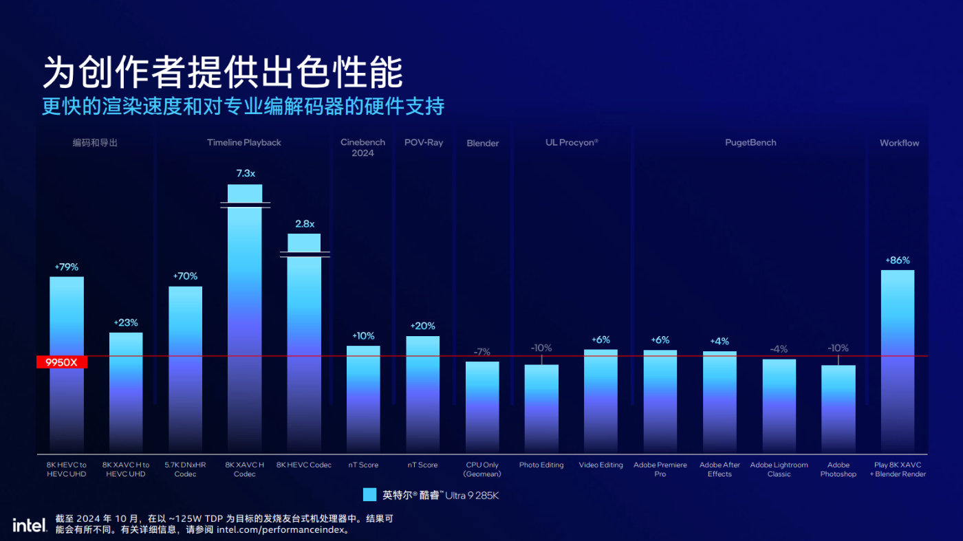 如果與AMD Ryzen 9 9950X競品做比較,酷睿Ultra 9 285K遊戲性能想到相當。在一些注重緩存性能場景中,酷睿Ultra 9 285K可以做到5%到7%的提升,而如果是多線程性能表現,酷睿Ultra 9 285K更勝一籌。