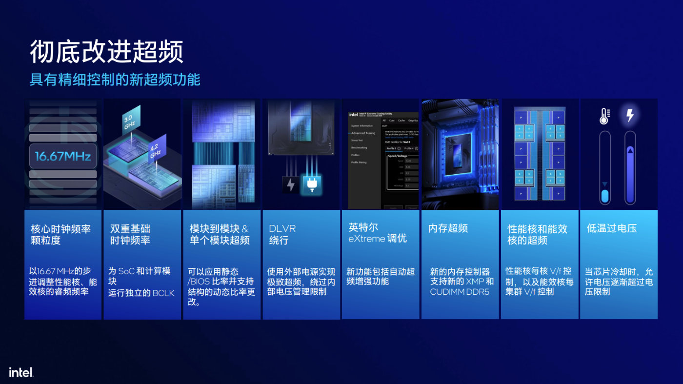 頻率,能夠對核心和核心的連接環以及內存、系統結構、系統 SoC 芯片進行更細緻的頻率調整,模塊間和 SoC 模塊能夠超頻,能夠對SoC模塊和各模塊間的接口做調整,以增加系統到內存的吞吐量。同時每個P-Core核心都有自己的電壓控制,每個E-Core集羣也用享有一個獨立的電壓控制,在極限超頻狀態下,用戶也可以繞過DLVR,實現極限超頻。