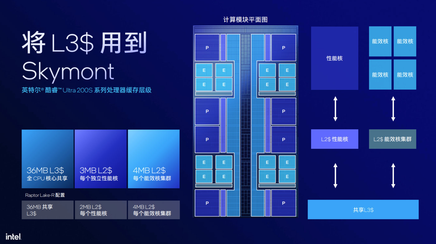 另外Arrow Lake中,Skymont E-Core集羣可以訪問36MB的L3緩存,這個設計的作用相當於Lunar Lake的8MB內存側緩存來保護Skymont沒有命中的影響。與此同時,與Raptor Lake Refresh相比,Arrow Lake的P-Core L2緩存從2MB增加到了3MB,4個E-Core共享一套4MB L2緩存。