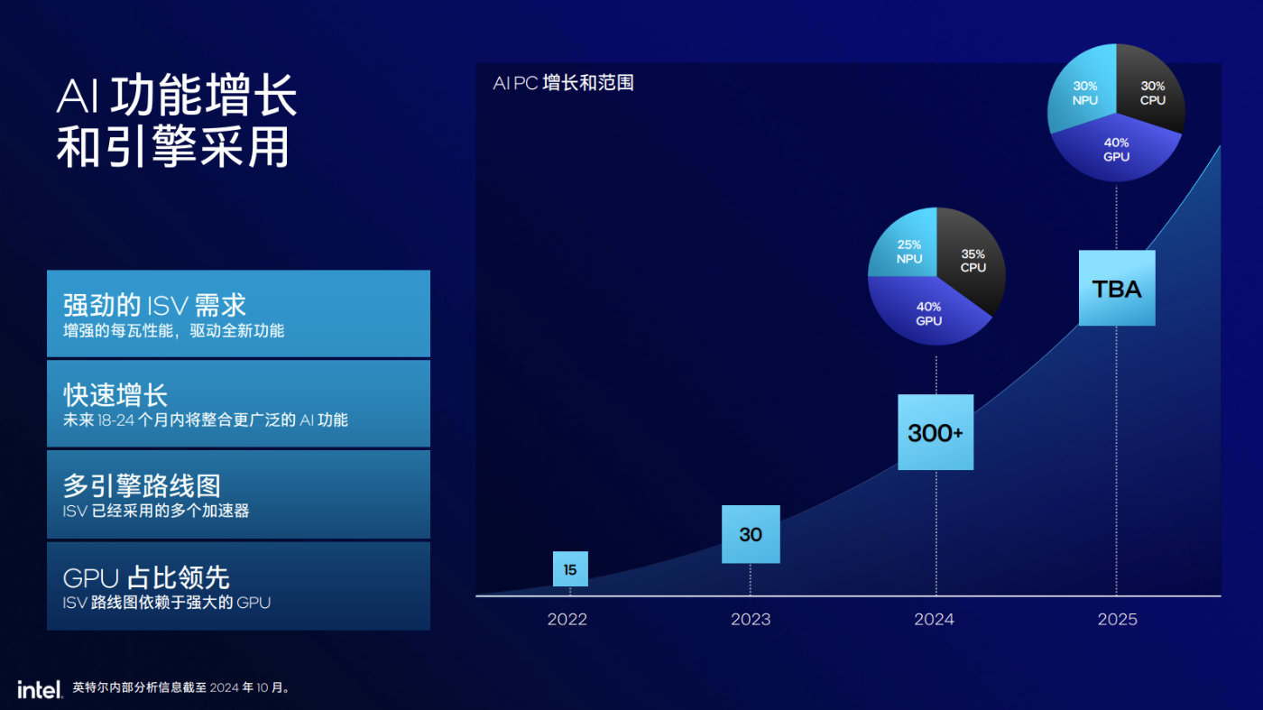由於英特爾長期與專業軟件供應商保持合作,對AI需求的支持也更爲敏銳。比如僅依靠NPU無法成爲AI應用中的主導者,GPU仍然佔據AI應用算力的主流,明年大約有5%的功能遷移到NPU上實現。