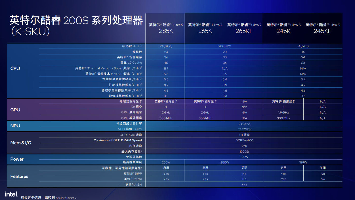 首次發佈的酷睿Ultra 200S均爲不鎖倍頻的K系列產品,包括頂配的酷睿Ultra 9 285K,酷睿Ultra 7 265K/KF,酷睿Ultra 5 245K/KF,換而言之,頂配酷睿Ultra 9 285K目前沒有不帶核顯的版本。由於不再使用超線程技術,能夠看到酷睿Ultra 200S爲一個核心對應一個線程。