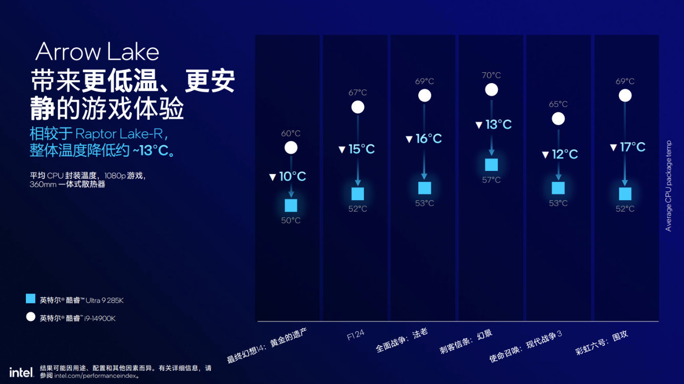 英特爾表示,在實際遊戲中,Arrow Lake與Raptor Lake的差距大約在3%左右,但Arrow Lake功耗處在更低水平。在現場演示的DEMO中,能夠看到功耗大約降低了80W,而諸如《神話時代》和《戰錘》這樣的遊戲中,系統層面的功耗降低超過125W。與此同時,Arrow Lake的峯值溫度降低了15℃到17℃。Arrow Lake無疑會成爲近幾年來溫度最低的遊戲CPU之一。