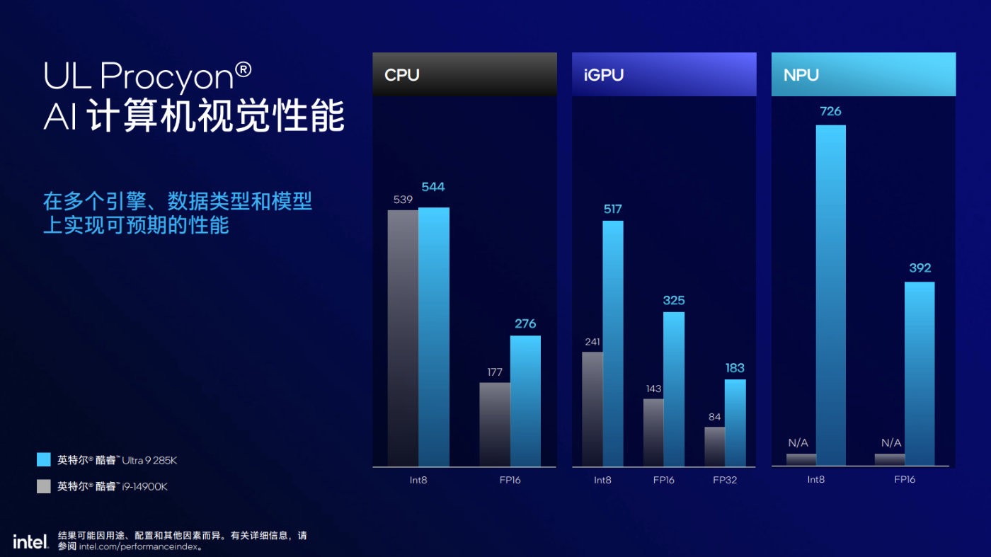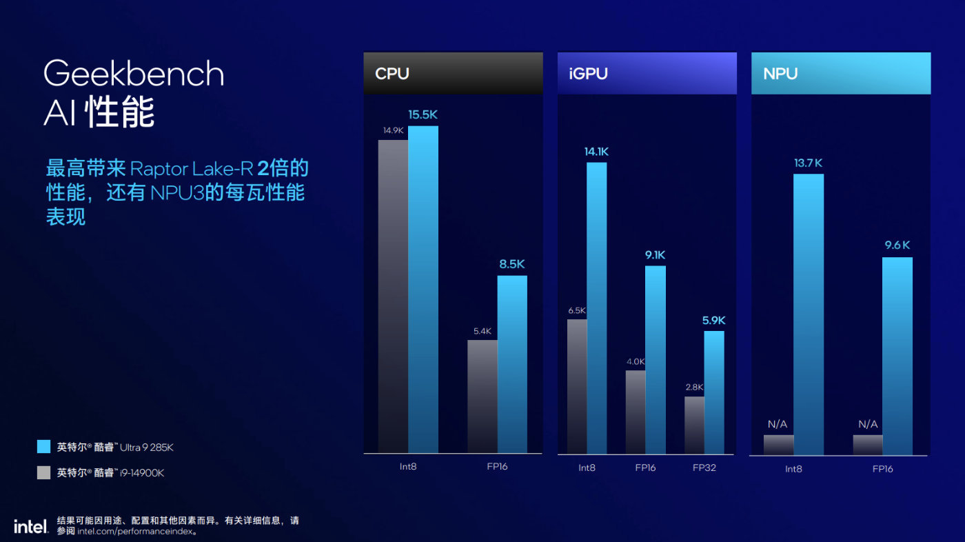 這裏英特爾引用Geekbench AI作爲參考,相對14代酷睿i9-14900K,酷睿Ultra 9 285K無論CPU、iGPU在INT 8和FP16上都有更顯著的提升,NPU則是做到了更好的補充。