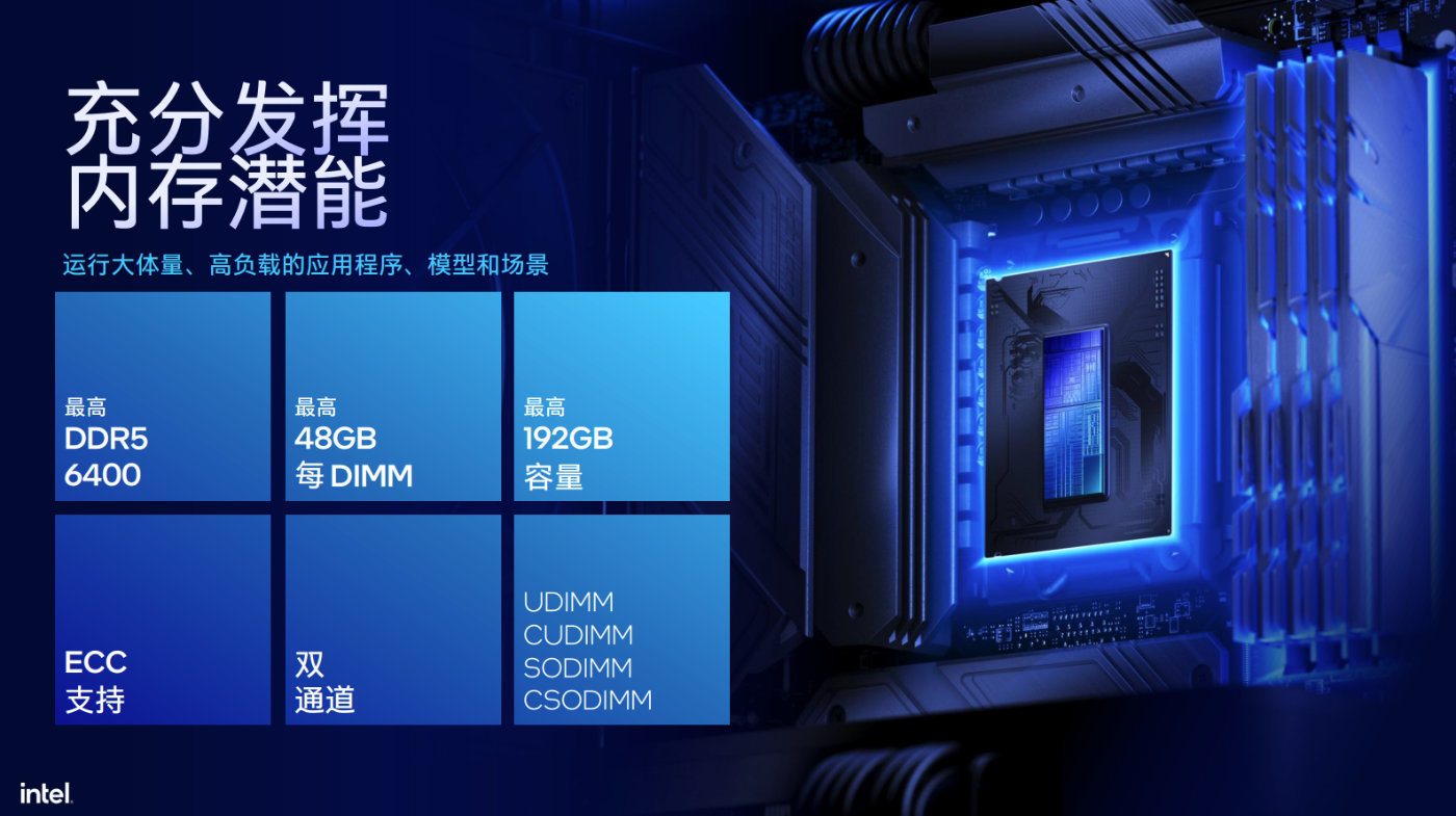 值得說明的是,雖然P-Core的峯值頻率相比Raptor Lake Refresh最高6GHz有所降低,但英特爾強調針對遊戲表現付出了很多努力,包括在遊戲負載期間,動態功耗大幅減少,每瓦性能提升,利用NPU和GPU加速,還能夠啓用數字線性電壓調節器,對每一個核心進行實時控制,並且對DDR5內存開啓X.M.P後的支持來到8000MT/s以上。