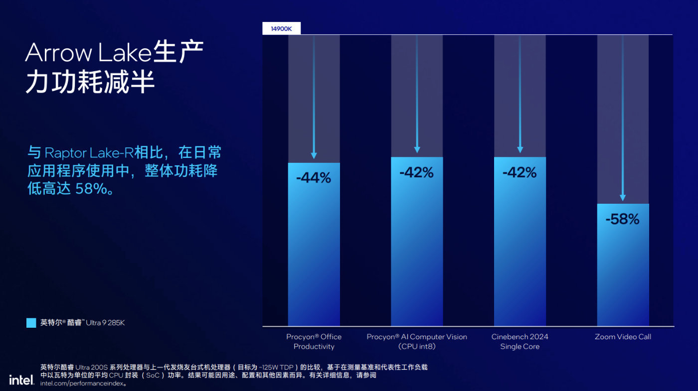 儘管從Raptor Lake Refresh上的32線程下降到現在Arrow Lake的24線程,但由於新架構設計下每週期指令數(Instructions Per Cycle,IPC)提升,以及多線程性能的表現,對於以來多核心數量的創作者、主播和高端用戶而言,收益非常明顯。包括整體功耗降低40%,多線程性能15%的提升,平臺溫度降低10℃,以及帶來NPU的AI加速功能。
