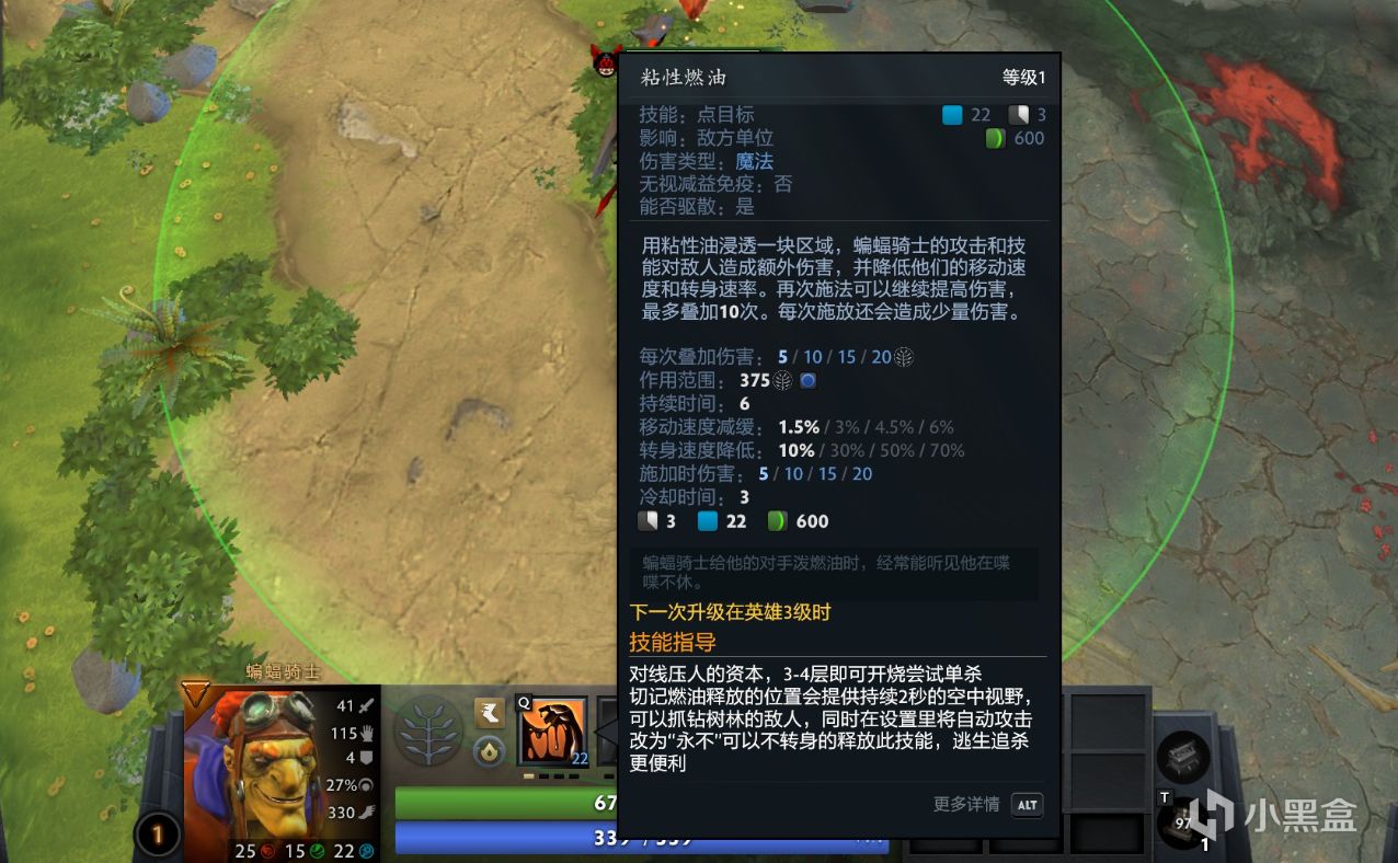 特殊的,蝙蝠骑士的燃油可以影响敌方英雄的转身速率,四级可以达到70%,理论上可以贴着敌方英雄转而让其一直在转身无法攻击与施法。