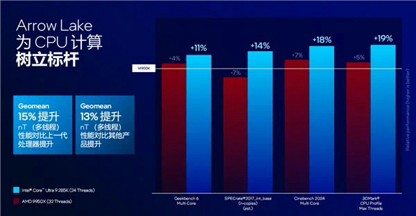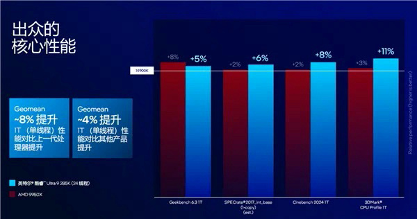 酷睿 Ultra 9 285K 對比上代 i9-14900K,單線程、多線程性能平均提升分別只有 8%、15% 左右,幅度確實不大,畢竟 P 核頻率降下來不少,一定程度上抵消了架構的改進。對比競品銳龍 R9 9950X,號稱單線程性能領先約 4%,而在 24 線程對比 32 線程的劣勢下,多線程優勢依然領先約 13%。