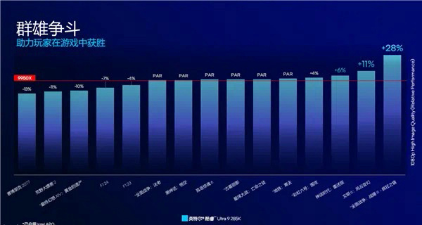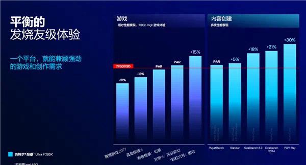 而在對比競品上,intel 爲酷睿 Ultra 9 285K 選擇的對手是銳龍 R9 9950X 而非 X3D 系列,而且打開了 APO 加速(下同),整體基本不相上下。