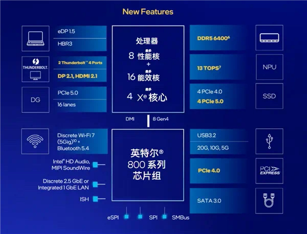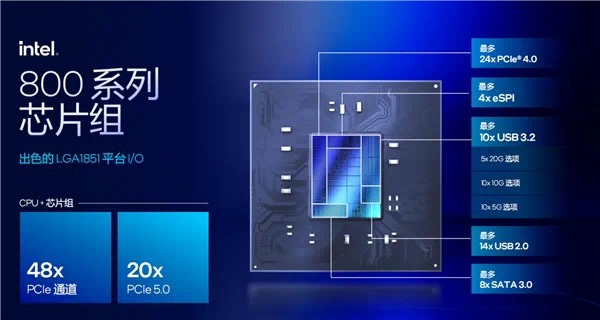 酷睿 Ultra 200S 系列改成了新的 LGA1851 封裝接口,必須搭配新的 800 系列芯片組主板,不再兼容老系列。新的芯片組首發型號爲高端 Z890,支持 24 條 PCIe 4.0,對比 Z790 少了 4 條。這個差距由處理器來彌補,而且是更先進的 PCIe 5.0,總計 20 條 PCIe 5.0(分別爲顯卡 16 條和 SSD 4 條)、4條PCIe 4.0。整個平臺可提供 48 條 PCIe 通道,和上代數量相同,PCIe 5.0 比上代多了 4 條。十個 USB 3.2(可配置五個 20Gbps 或者十個 10Gbps 或者十個 5Gbps 等等不同組合)、14 個 USB 2.0、8 個 SATA 6Gbps 這些都沒有變化。