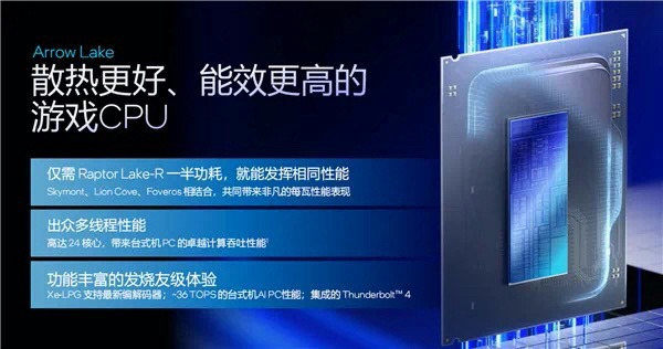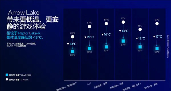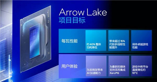 畢竟 intel 這幾年在能效方面喫了很大的虧,過高的功耗和發熱嚴重影響體驗,尤其是 13/14 代酷睿爲了追求高頻率而犧牲了穩定性,官方也表示確實從中吸取了很多經驗教訓。Arrow Lake 從設計之初就定下了明確的目標,整體功耗降低大約 40%,遊戲溫度降低大約 10℃,多線程性能提升超過 15%。