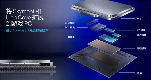 酷睿 Ultra 200S 系列也是多個模塊組成的分離式架構,包括計算模塊(CPU 和緩存)、GPU 模塊、SoC 模塊、IO 模塊四大部分。它們統一通過 Foveros 3D 封裝技術整合在基礎模塊(基底)上,進而整體封裝,接口爲新的 LGA1851。