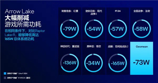 遊戲中的功耗也有明顯降低,酷睿 Ultra 9 285K 對比 i9-14900K 降低平均約 73W,但具體降多少取決於遊戲,不同遊戲差異非常大,而且注意對比是系統功耗而不是 CPU 功耗。比如《黑神話:悟空》這種不怎麼依賴 CPU 的遊戲,性能不變但可以降低 34W 系統功耗,《刺客信條:幻景》降低了80W。《戰錘:太空陸戰隊2》是效果最好的,可以降低大約 165W 系統功耗,性能還可以小幅提升4%。《神話時代:重述版》中的效果也非常明顯,系統功耗可以降低 136W,同時性能提升約 6%。