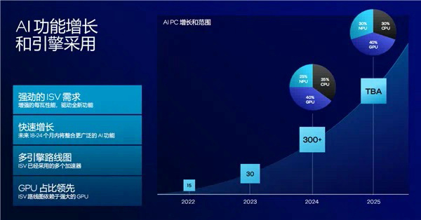 儘管 NPU 一直被強調是 AI PC 的重要元素,但 GPU 仍然是最強大、最廣泛使用的AI引擎,今年的 AI 應用中大約 40% 都依賴於 GPU 加速,NPU 的佔比則只有 25%,甚至遠低於 CPU 35%。但是隨着 NPU 算力的不斷提升,軟件開發者對 NPU 的不斷熟悉,應用範圍也會越來越廣,預計明年的 NPU 應用佔比可以達到 30% 左右,基本與 CPU 持平,GPU 則仍然可以穩定佔到 40% 左右。