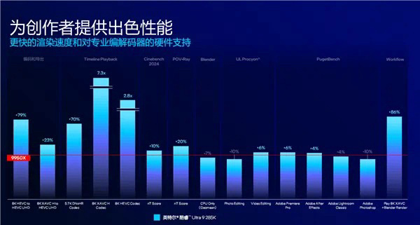 在對比銳龍 R9 7950 X3D 時,intel 承認整體不如,而且別忘了它也是雙 CCD,並不是特別適合遊戲,如果換成銳龍 R7 7800 X3D 差異會更大。但是 intel 強調,在生產力性能上可以大幅領先,比如做圖形渲染、視頻編碼轉碼的時候。