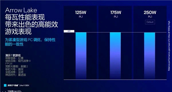 以上性能數據都是在 PL1 250W 功耗下測出來的,但是逐漸降低 PL1,比如到 175W、125W,遊戲性能並沒有明顯損失,仍然保持一致。因此,酷睿 Ultra 200S 系列非常適合用於迷你機,在有限的空間內限制功耗,也不會影響性能。或者你喜歡降壓,也不用擔心性能隨之降低。