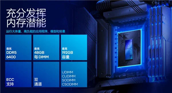 內存方面,酷睿 Ultra 200S 系列放棄了 DDR4,僅支持 DDR5,標準頻率也從 4800MHz 大幅提高到 6400MHz(當然也可以繼續超頻)。ECC 還是硬件支持的,但普通主板不會開啓,只有在企業級商務平臺上纔會有。