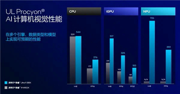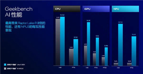 另外在 GeekBench AI、UL Procyon AI 兩項基準測試中,intel 聲稱酷睿 Ultra 9 285K 可以帶來翻倍的 AI 性能。其中 CPU 部分提升幅度較小,GPU 性能有兩三倍的增長,NPU 更是實現新的突破,可以在更多數據類型和模型上運行,部分時候效率遠超 GPU。