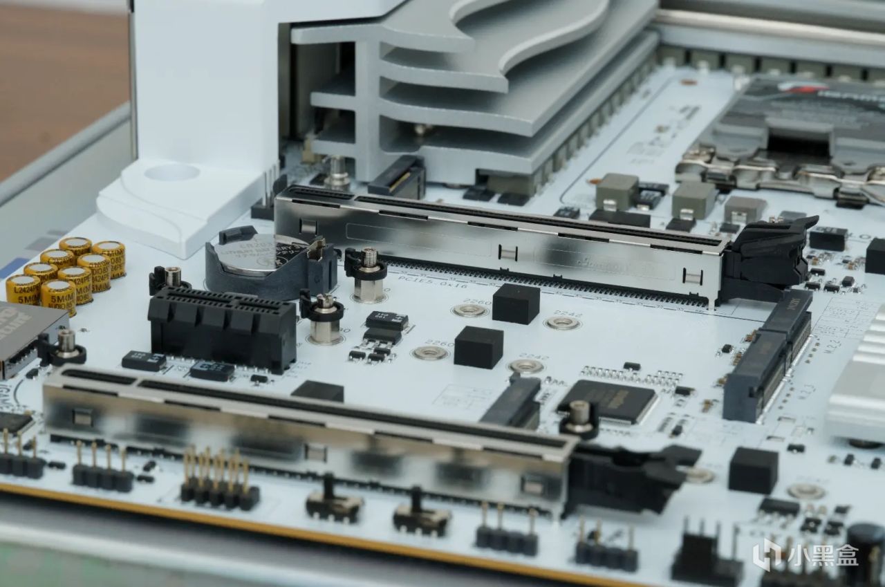 ▲再換個角度,兩個全尺寸PCIe接口均擁有金屬裝甲加固,靠近CPU的爲PCIe 5.0x16規格,最下端的爲PCIe4.0x16速率,而黑色的PCIex1接口爲PCIe4.0x1速率。